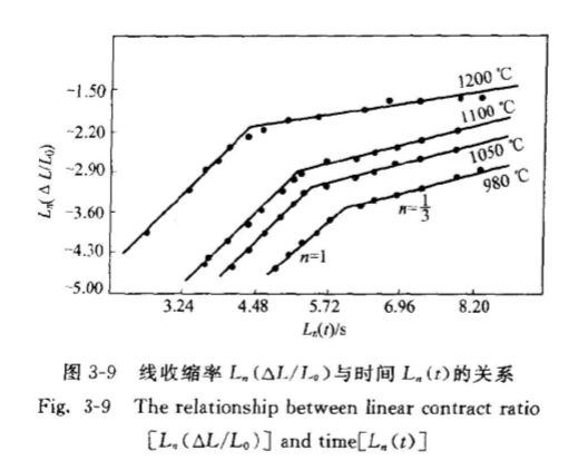 即線收縮率△L/La正比于時間t。根據(jù)普通粉體以擴散傳質(zhì)為主的固相燒結(jié)模型,初期燒結(jié)的動力學關(guān)系為△L/ L=kt對于不同的擴散傳質(zhì)機理,式中指數(shù)n取值在2.5~5之間變化。