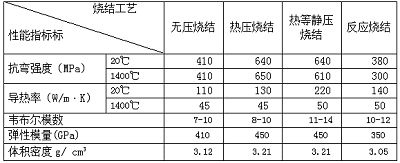 SiC的反應燒結法最早在美國研究成功。反應燒結的工藝過程為:先將α-SiC粉和石墨粉按比例混勻,經干壓、擠壓或注漿等方法制成多孔坯體。在高溫下與液態Si接觸,坯體中的C與滲入的Si反應,生成β-SiC,并與α-SiC相結合,過量的Si填充于氣孔,從而得到無孔致密的反應燒結體。反應燒結SiC通常含有8%的游離Si。因此,為保證滲Si的完全,素坯應具有足夠的孔隙度。一般通過調整最初混合料中α-SiC和C的含量,α-SiC的粒度級配,C的形狀和粒度以及成型壓力等手段來獲得適當的素坯密度。