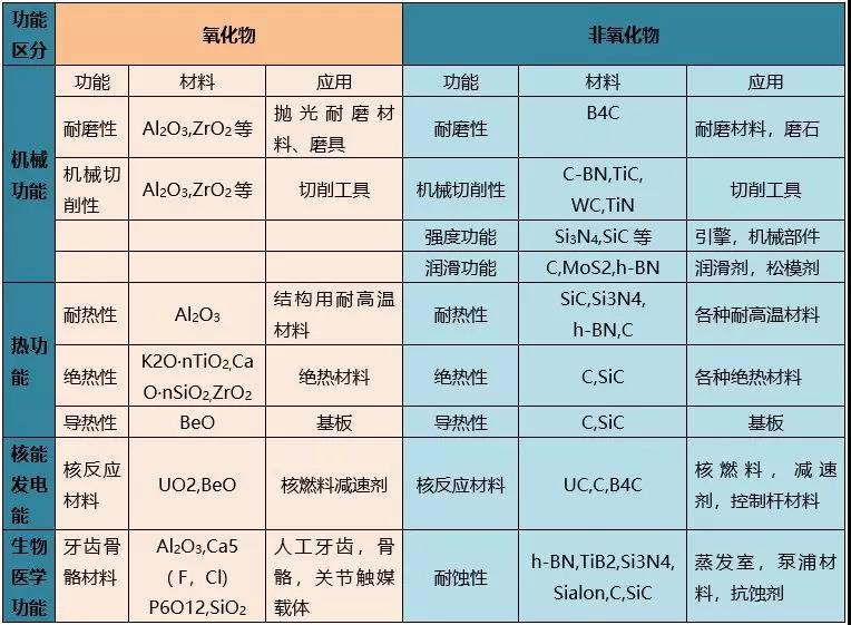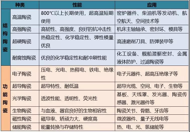 先進(jìn)陶瓷應(yīng)用性能分類